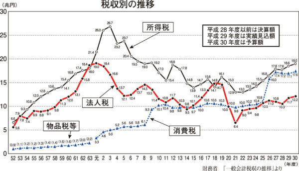 財務省が発表している一般会計税収の推移を見ると、消費税が導入された1989(平成元)年に19兆円あった法人税は2018年度(予算額)で12・2兆円と約7兆円減となっており、逆に消費税は導入時の3・3兆円から2018年度には17・7兆円と、14・3兆円の増となっている。2008年度には法人税収と消費税収が逆転し、今では国税収入の約4割が消費税によるものとなっている。