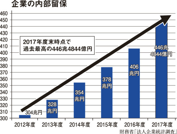 法人実効税率は減額続きで、2011年には39・54%だったのが2012年に37%に減税。さらに14年=34・62%、15年=32・11%、16年=29・97%に引き下げ、2018年度には29・74%まで引き下げている。法人実効税率は2%の引き下げで約1兆円規模の減税となる。この間の10%近い減税によって、大企業全体で5兆円規模の減税措置を受けており、その分が消費増税によって賄われている。