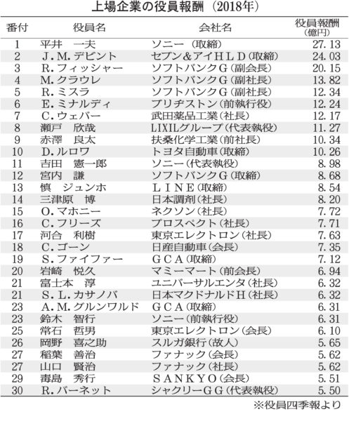 東京商工リサーチの調べでは、日本国内で2018年3月期に1億円以上の報酬を得た役員の数は538人にのぼる。そのうち、上位30人【図参照】を見てみると、ソニーのCEOを退任した平井一夫の27億1300万円を筆頭に、上位10人の報酬は10億円をこえ、多くを外国人経営者たちが占めている。ルノーから送り込まれた18位(過少申告による順位。実際にはルノー、日産、三菱自動車の3社から19億円の報酬を得ていた)のカルロス・ゴーンに限らず、大企業の資本を外資が握る過程で、海外からやってきた経営者が企業トップの座につき、報酬そのものも「グローバル・スタンダード(世界基準)」を追う形で高額化してきた。グローバル化に日本市場がガッチリと組み込まれ、草刈り場にされていることを物語っている。