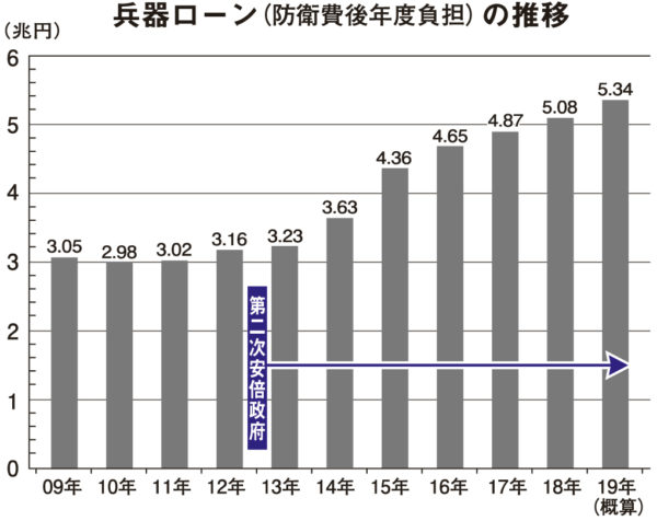 こうしたなかで11月、防衛省が国内軍事関連企業62社に装備品代金の支払延期を求める動きが表面化した。「追加発注をするかわりに、2~4年後に今年度の代金も含めて一括払いする」という内容で、資金繰りに困る企業側が強く反発した。この「支払延期」を招いた原因が、戦闘機やミサイルなど高額兵器を買い込む場合に適用する「兵器ローン」(後年度負担=複数年度に分けて装備代を払う)が増えすぎ、いまだに歯止めがかからないことだった【グラフ参照】。安倍政府がアメリカの要求を丸呑みし、防衛予算では賄えない額の兵器売買契約を結ぶため、いくら返済額を増やしても追いつかないからである。