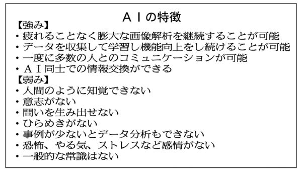 AIはルールや膨大なデータに基づいて諸関係を覚え、記憶や専門知識を引き出し、今後の展開を予測する能力では人間を上回る段階に達している。しかし主体性や意志、感情があるわけではない。そのため人間があたりまえにおこなう「なぜ?」という問いを抱いたり、喜びや悲しみを感じることはない。ひらめきから独創的な企画を生み出したり、創造力を発揮することはできない。いくらAI技術が発達しても、医療・福祉・介護・教育分野など人間性や創造性が求められる分野の仕事は代替できない。