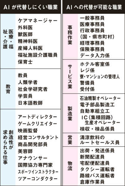 オックスフォード大学との共同研究で「10~20年後に49%の職業がAIやロボットで代替可能になる」と結論づけた野村総研(NRI)は、AIへの代替可能な職業として100種を指摘した。その主な職種を見ると、これまで自動化が進んできた自動車組み立て工などの製造業に加え、一般事務員、医療事務員、行政事務員など事務・営業職が目立っている【表参照】。