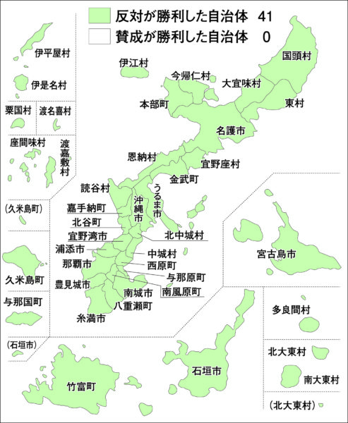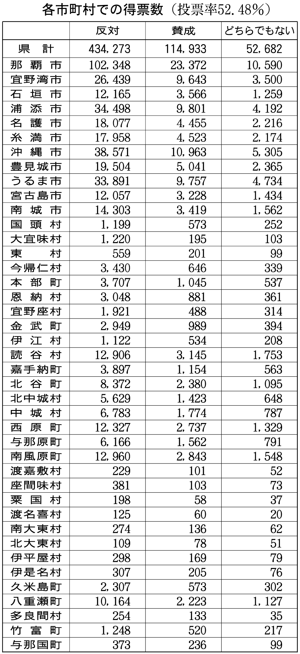 なお、県議会での条例可決後、県民投票における投票事務を拒否する方針を示していた宜野湾、沖縄、うるま、宮古島、石垣の五市長や保守系議員らが、選択肢への追加にこだわっていた「どちらでもない」は5万2682票で、投票総数の8・8%だった。普天間基地を抱える宜野湾市でも投票率は51%を越え、66・8%に上る2万6439人が反対票を投じている。