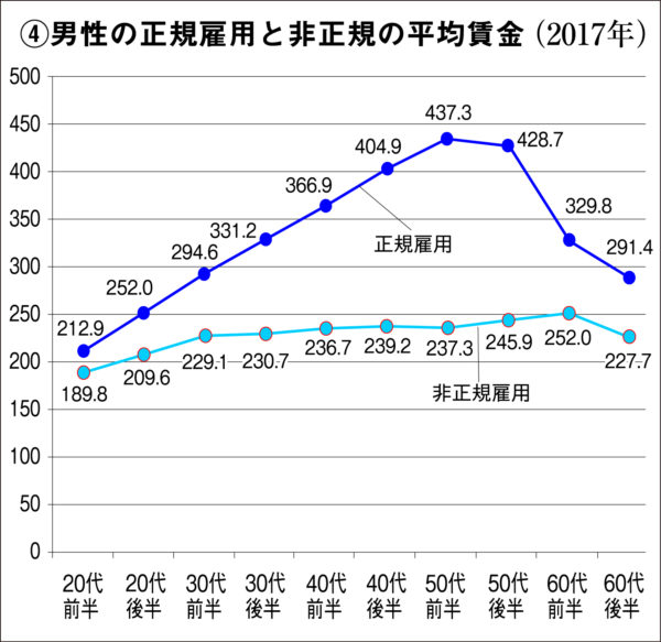 少子化と同時に進むのが単身世帯の増加だ。非正規雇用者は正社員に比べて貯蓄が少なく、社会保険の加入率も低い【グラフ④参照】。そのまま年金を受給する世代になると、月7万円に満たない国民年金しか受けとれない。