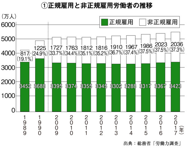 総務省の労働力調査によると、雇用者に占める非正規社員の比率は2008年当時の25~34歳で25・6%だったが、同世代の10年後にあたる18年の35~44歳は28・8%と悪化している。35~39歳の男性の平均年収はこの20年で77万円減った。そして全労働人口に占める非正規雇用は38・3%(2017年)となり、現在も増え続けている【グラフ①参照】。それによって大企業の内部留保は6年連続で過去最高を更新し、2017年には446兆4844億円にのぼるなどボロもうけしているのだ。