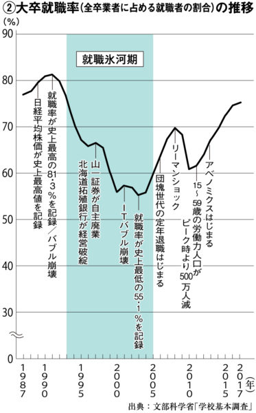 大卒就職率はバブル崩壊直後までは80%前後の水準を維持していた。ところが1992年からはバブル崩壊の影響で新卒採用が絞りこまれ、下降の一途をたどった【グラフ②参照】。95年には65・9%まで落ち込んだが、これは氷河期の序章に過ぎず、大手証券の山一証券が97年に廃業に追い込まれた頃、就職率はさらに落ち込み、2000年に統計上初めて6割を下回る55・8%をつけた。
