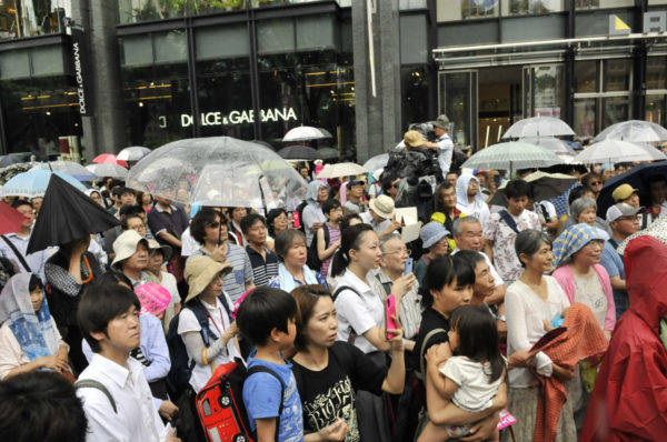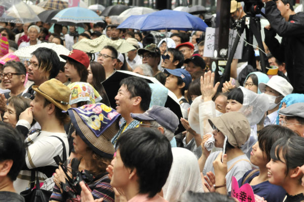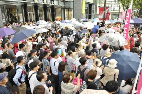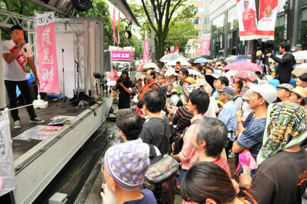 参院選に10人の候補を擁立した、山本太郎が代表をつとめる「れいわ新選組」は19日正午、名古屋市栄の名古屋三越ラシック店前で街頭演説をおこなった。雨天にもかかわらず、若い世代から年配者まで多くの人々が歩道を埋めるほど集まり、1時間余りにおよぶ山本太郎の演説に聞き入った。とくに若い世代の姿が目立ち、有権者一人一人と直接結びつくことによって、まったく新しい市民による政治勢力をつくることに強い期待が注がれた。演説の合間には何度も「頑張れ!」の声援や太郎コールが沸き起きるなど終始賑やかな演説会となった。
