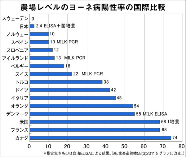 デンマークは有名な酪農国でチーズがおいしいイメージがあるが、総頭数約160万頭のうち、肉牛農場の55%、酪農農場の85%がヨーネ病の陽性農場という信じがたいほどの汚染状況だ。任意の防疫プログラムがあるが費用は自腹のため、2009年時点で参加しているのは全酪農家の29%に過ぎないという。
