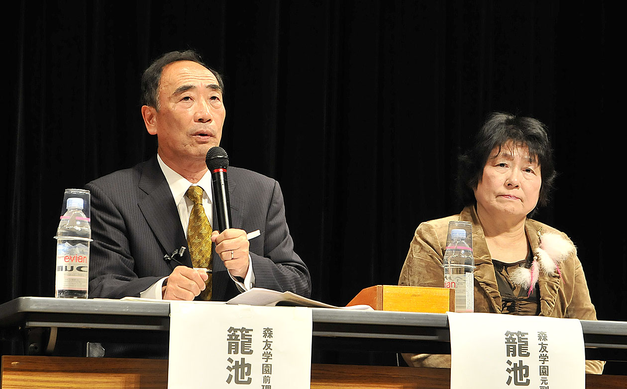 長崎市で講演する籠池泰典、詢子夫妻(6日)