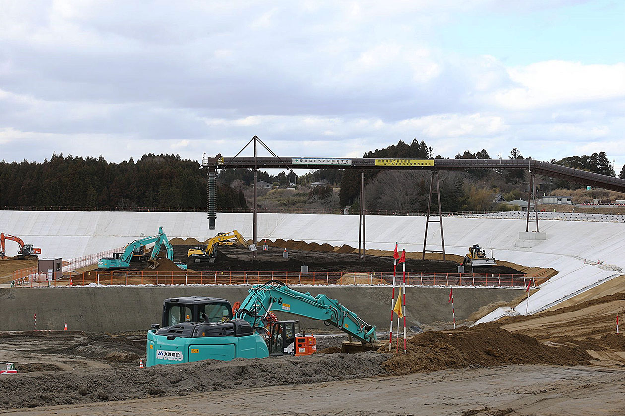 双葉町の中間貯蔵施設。黒い土が中間貯蔵施設へ流れ、地ならししている(2月19日)