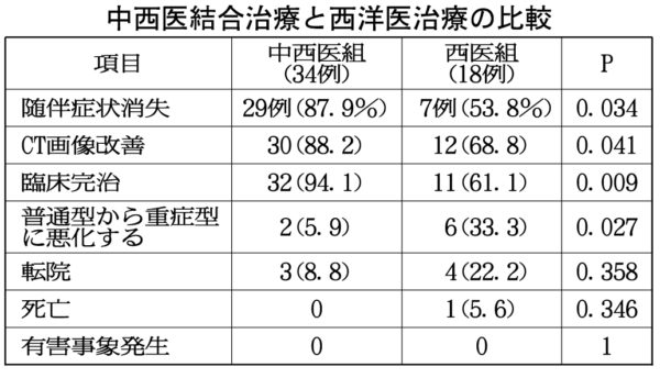中西医結合群の退院時の随伴症状消失率87・9%、CT画像改善率88・2%、臨床完治率94・1%及び普通型から重症型に悪化する率5・9%も、西洋医群よりも有意に高かった(表参照。P<0・05またはP<0・01)。これらの結果から、中西医結合でコロナ肺炎を治療する時は患者の症状を顕著に軽減し、病程を短縮し、完治率を高めることができると推測しています。
