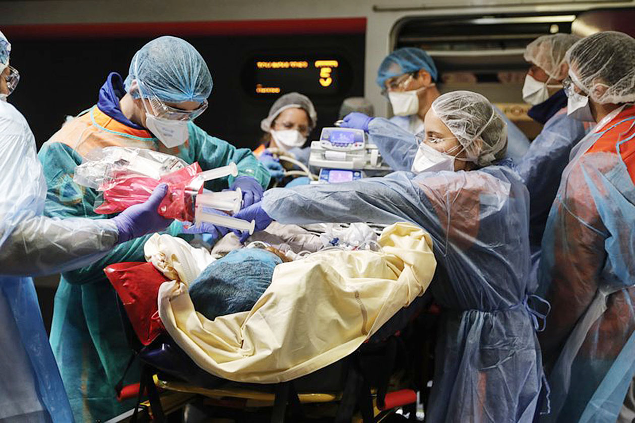 救急搬送された新型コロナ感染者を治療する医療スタッフ(フランス西部レンヌ)