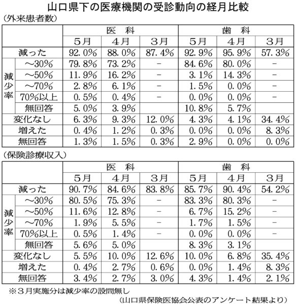 山口県の開業医のなかで、とくに厳しい状況に陥っているのが小児科と耳鼻科だ。直接、口の中を治療する歯科も患者数が急減している。山口県保険医協会がおこなっているアンケート【表参照】で、外来患者数が「減った」と回答したのは、医科で3月は87・4%、4月は88・0%、5月は92・0%にのぼった。歯科でも3月が57・3%、4月が95・9%、5月は92・9%だ。医科・歯科ともに5月は9割の医療機関が患者数の減少と保険診療収入の減少を訴えており、県下の医療機関の苦境が浮き彫りになっている。小児科では5月段階で、外来患者数・保険診療収入ともに減少率が「5割減」「7割減」との回答があわせて8割にのぼる。