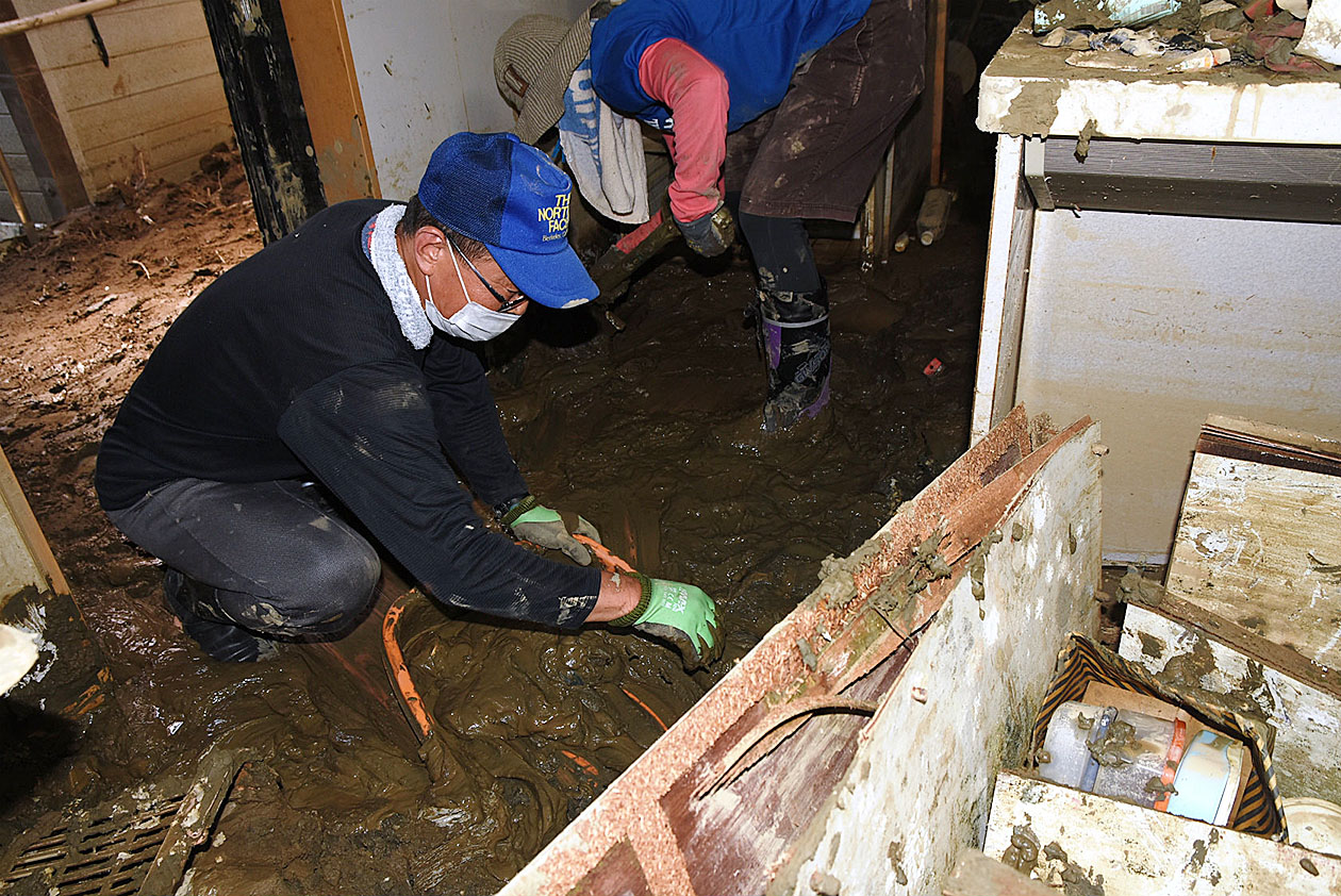 酷暑のなか手作業で家の中に堆積した泥をかき出す(球磨村神瀬地区)