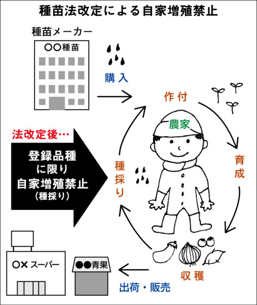 農水省はその理由として「自家増殖原則禁止が国際標準であり、日本はとりくみが遅れている」とのべている。その延長線上に「種苗法改正」があり、「自家増殖禁止」を原則にし、種子を企業から買わせようとしている。