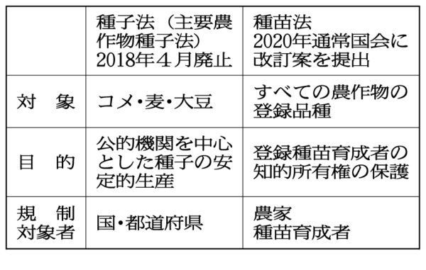 さらに2018年4月に種子法廃止が施行されると、これと重なるように農水省は「自家採種・自家増殖」を「原則容認」から「原則禁止」に切り変える「種苗法改正」の検討を開始し、今年3月3日に閣議決定した。当初は2021年4月施行をもくろんでいた。