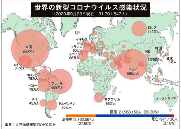 世界保健機関(WHO)によると、開発中の新型コロナのワクチン候補は9月17日時点で182種類にのぼり、そのうち人に投与する臨床試験(治験)を始めたものは36種類ある。先行しているのは、アストラゼネカ(英国)、ファイザー(米国)、ビオンテック(独)、カンシノ(中国)、モデルナ(米国)、シノバック(中国)、ガマレヤ研究所(ロシア)、シノファーム(中国)などで、9社が三段階ある治験の最終段階に入っているとされる。