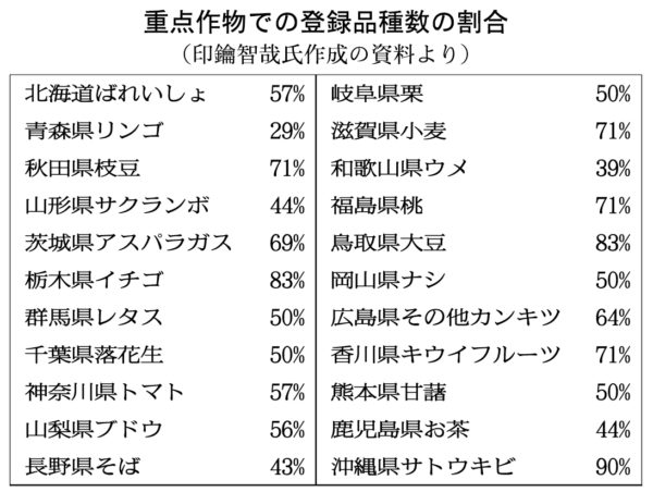 各県の重点作物の登録品種数の割合【表参照】を見ても、「影響はない」といいきれない数値となっている。