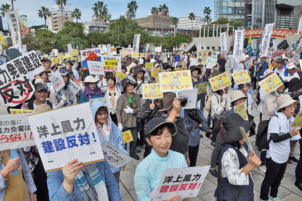 同じ前田建設工業が進める山口県下関市の安岡沖洋上風力発電も、住民の立ち上がりによって実質頓挫に追い込んでいる。7年前、前田建設工業が住民説明会を開くと、学者や医師が風力発電の健康被害を訴え、その内容が全市に伝えられた。安岡地区の自治会や医師会、漁業者、商工会、宅建協会が次々と市長に反対の陳情をおこない、風力反対署名が10万筆をこえるなか、市議会は風力反対の陳情を全会一致で採択した。反対する会は毎月の街頭活動や1000人デモ行進を旺盛におこない、漁業者は補償金の受けとりを拒否して風力反対を貫いている。