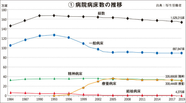 それが1985年の医療法改定を機に1990年以降は一転して減少傾向に転じる(グラフ①参照)。90~95年に1万床減、95~2000年は3万床減、2000~05年は五万床減、05~10年は6万床減、10~15年は4万床減となっており、減少のテンポは加速している。1993年から2018年までの25年間を見ると、およそ30万5000床の削減だ。
