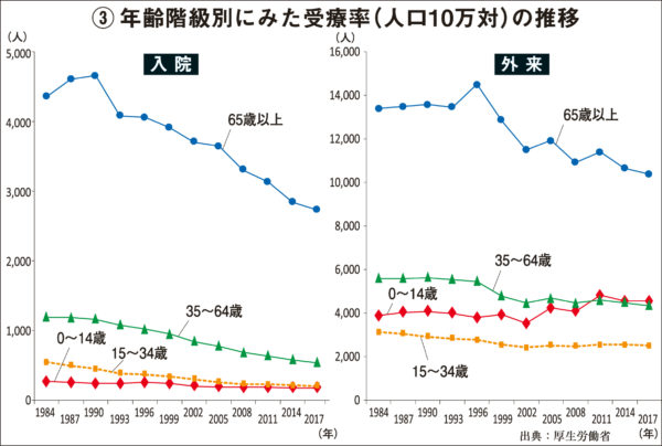 DPC制度では患者を一定期間以上入院させると医療機関の持ち出しになる。同じ病気でも一人一人の年齢や体調、体力によって回復にかかる時間は異なるにもかかわらず、医療機関は平均在院日数を短縮することが求められ、現在では手術後で自宅療養が難しい患者でも、退院して自宅で療養するか、リハビリ施設などに転院したりしなければならないのが一般的になっている。こうして入院にしろ外来にしろ、受療率は大幅に低下している(グラフ③参照)。