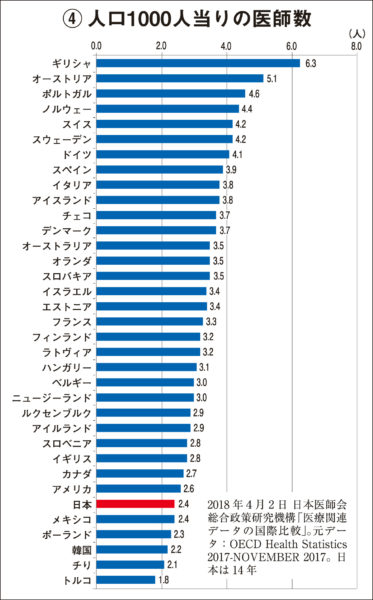 しかし日本の人口1000人当りの医師数は2・4人と、OECD加盟の35カ国中で30位というのが実態だ(グラフ④参照)。厚生労働省の調査では医師免許を取得している人は増加しているが、これには厚労省の医系技官や引退した医師など医療現場に携わらない人数も含んでいるため、実際の医師数の水準は非常に低い。これは1983年から20年にわたって医学部の定員抑制がおこなわれてきた結果といえる。