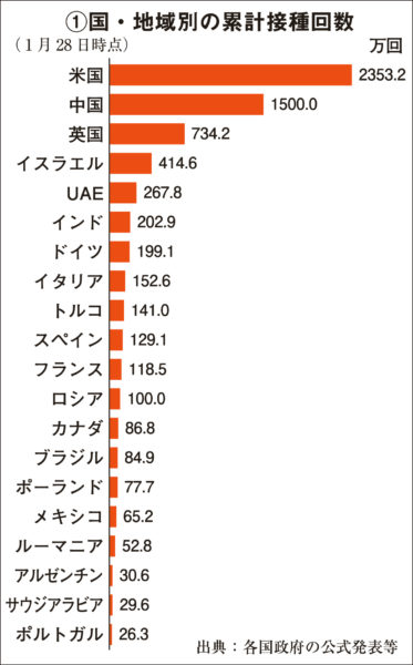 新型コロナワクチンの接種は昨年12月8日のイギリスを皮切りに、同14日にアメリカで開始されたのに続き、世界各国で本格化した。1月27日までに新型コロナワクチンの接種を開始した国は世界で57カ国・地域【グラフ①参照】で、世界のワクチン接種率は0・9%ほどだ。世界的な集団免疫を獲得するには世界人口の約70%がワクチンを接種する必要があるとWHOが発表しているが、それには遠く及ばない。