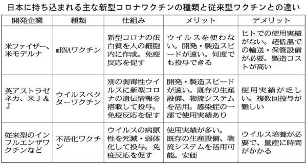 一般的な感染症のワクチン開発は、基礎研究の後、動物を使った非臨床試験に半年、ヒトに対する3段階の臨床試験(治験)に4~5年以上かかるのが通例で、最短記録である流行性耳下腺炎(おたふく風邪)のワクチンでさえ4年を要している。インフルエンザなどで従来から使用されてきた不活化ワクチンや生ワクチンは、孵化鶏卵を使ったウイルスの培養が必要で量産に時間がかかる。そのため、新型コロナワクチンの早期使用を目指す国や企業は、これまでにないスピードで開発・製造できる遺伝子ワクチンを採用し、開発から治験までの期間を1年に短縮して接種にこぎつけている【表参照】。