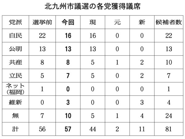 自民党議員の得票合計は前回10万1480票(無所属で出馬し当選後自民党に変わった候補の票も含む)だったが、今回は9万5120票になり6360票減らしている。しかも自民党候補の得票を見ると票数を激減させた候補が目立つ。前回の得票より1000票以上減らしたのは、中島慎一(門司区で当選、1152票減)、佐藤茂(小倉北区で落選、1640票減)、片山尹(小倉南区で落選、2049票減)、三原朝利(若松区で当選、2624票減)、村上幸一(八幡西区で当選、2066票減)、宮崎吉輝(八幡西区で当選、1129票減)、佐々木健五(八幡西区で落選、1121票減)の各候補で、7人に達した。公明は立候補した13人が全員当選したが、全候補の合計得票は6万9067票で、前回選挙の全候補合計得票(7万4919票)から5852票減らした。