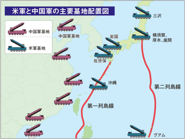 こうした動きに先駆けて中国も米国も日本を挟んで主要軍事基地を置いてきた【米軍と中国軍の主要基地配置図参照】。中国は北から旅順、青島、寧波、福州、湛江、楡林等海岸線の都市に軍事拠点を配置している。米軍は最前線の第一列島線上に岩国、佐世保、沖縄等の軍事拠点を配置し、第二列島線上には三沢、横須賀、厚木、座間、グアム等の軍事拠点を配備している。