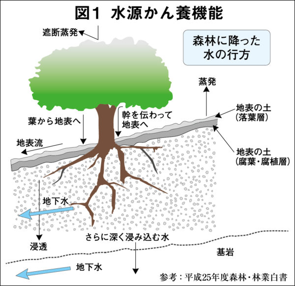水源かん養保安林は、流域保全上重要な地域にある森林の河川への流量調節機能を安定化し、洪水などの災害が起きにくくするために指定される。「森があれば水が豊かになる」とよく表現されるが、これは水の総量が増すのではなく、森が豊かになると土壌層を厚く保つことによって土に浸透してゆっくり川に流し、地下水に到達する水を浄化するという意味だ。川まで一気に流さないという意味で洪水時の流量を減らす役割がある。