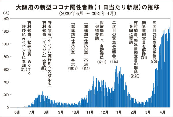 大阪府の新型コロナ新規感染者数は、3月後半から東京都を抜いて全国最多となり、3月末からは1日当り1000人以上の高止まりが続いている。4月15日には初めて1200人に達し、5月1日の1262人に至るまで過去最多を更新中だ。第三波のピークが654人(1月8日)であり、第四波は約2倍の勢いで感染が拡大していることになる。1週間に8000人の速度で感染者が増え続け、医療体制はすでに崩壊状況に陥っている。