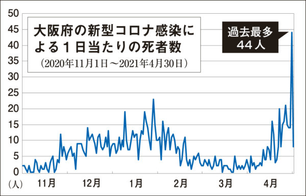 大阪府では宿泊療養のためのホテルの確保も進まず、事実上の入院待機患者(自宅療養も含む)は1万4000人をこえている。3月1日から4月29日までの間、自宅療養・待機中に死亡した人は12人にのぼり、求める治療が受けられず、死に方も選べない確率が高まっており、「医療崩壊ではなく社会崩壊に近い」(北村義浩・日本医科大学特任教授)と指摘する声もある。
