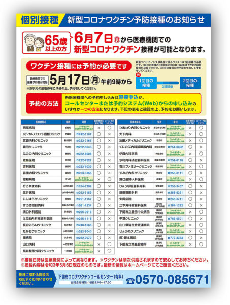 同時に17日には、医療機関でおこなう個別接種の受付が始まる。市内では100をこえる医療機関で接種が可能となっている。