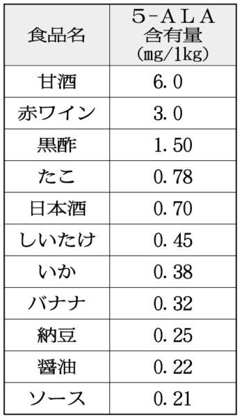 5-ALAは、ヒトや動物、植物の細胞内でつくられ、緑黄色野菜や甘酒、ワイン、日本酒、納豆などの発酵食品に多く含まれており、多くの人が日常的に摂取している自然由来の物質【表参照】だ。ただ体内で生成される量は17歳をピークに加齢とともに減少し、食品から得られるのは微量。これを補い、5-ALAの濃度を一定以上に保つことができれば感染症や健康維持に高い機能性を発揮する。そのため10年以上前から抗がん治療法やサプリメントなどの栄養補助食品として活用されてきた。
