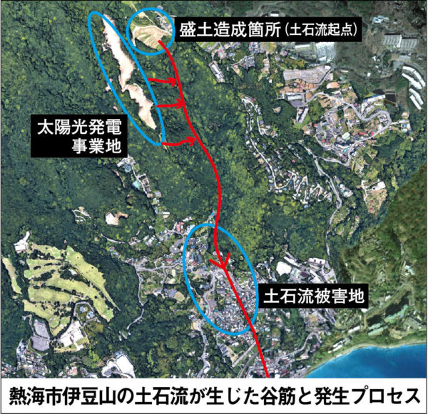 この谷筋の尾根筋には今、ソーラーパネルが並んでいます。造成のために頂部を削った土で小さな谷を埋め、尾根筋に広い平坦地が作られました。当然、それまで土中に浸み込んでいた水は、浸透せずに周辺に流れ出します。浸み込まずに表層を流れた水は、表土を削りながら大半は土石流発生渓流へと流入していきます。土石流発生後の今もなお、その流亡は降雨の度に続いていることでしょう。ここは静岡県の検証が待たれます。