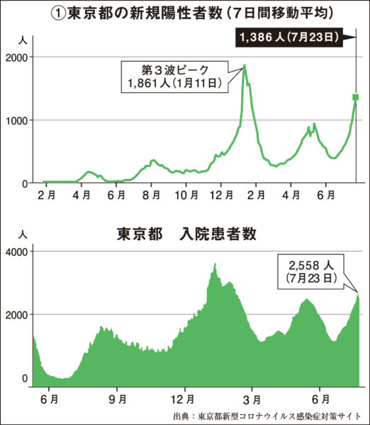 6 月半ばから増加を見せていた東京都内の新規感染者数は、五輪開会式前日の22日には1979人に達した。1900人をこえるのは1月15日(2044人)以来。23日現在の直近7日間の平均は1386人となり、前週比で146・5%となった【グラフ①参照】。24日現在の入院患者数は2638人で、重症者は74人。病床使用率は中等症病床で44%、重症病床で19%。ホテルを活用した宿泊療養施設も不足しており、陽性者のうち自宅療養者は5460人、入院・療養等調整中(自宅隔離)は2031人に膨れあがっている。