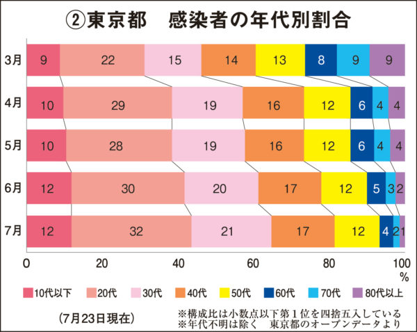 入院患者の年代別割合(19日時点)では、3月時点では全体の15%程度に過ぎなかった40代以下の入院患者が、7月には55%を占めており、これまでは無症状が大半といわれた若い世代に高熱や肺炎など重い症状があらわれるケースが増している。