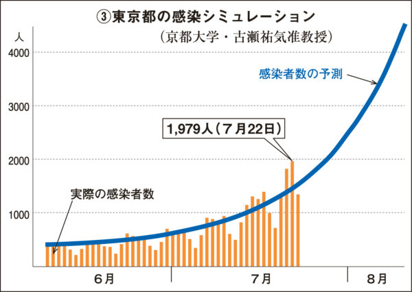 21日に開かれた厚労省の感染症対策専門家会合では、京都大学の西浦博教授が東京都の感染予測について試算結果を発表。現状では1日当りの感染者の増え方が、前週比1・5倍だが、試算ではそれより少ない1・3倍で推移したと仮定して、8月7日には3000人をこえ、同月21日には5235人にのぼる結果となった。前週比1・5倍の状況が続けば、8月中旬以降は1万人前後となる。
