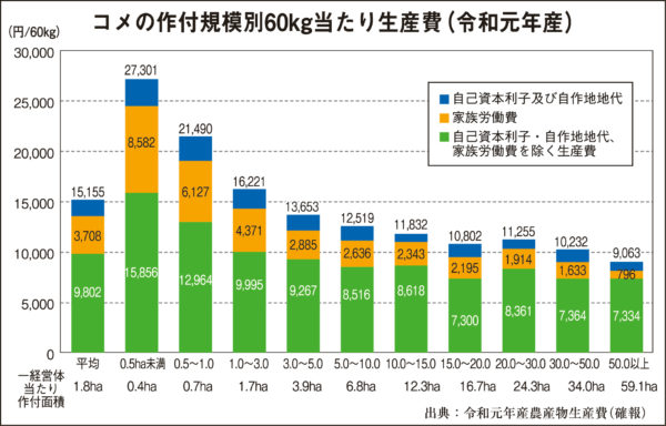 大規模化や農地集約が進行しているとはいえ、農家一戸当りの経営耕地面積は全国平均で1・5㌶ほどだ。農水省が公表している60㌔㌘当りの生産費(令和元年産)を見ると、平均に近い1・7㌶の場合、1万6221円かかっている【グラフ参照】。2019年におこなわれた農業経営統計調査では、中山間地域の多い中国地方の一俵(60㌔㌘)当りの生産費は他の地域より高い2万709円だ。そもそもが生産費に見合わない価格なのである。