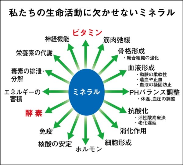 ミネラルは、「タンパク質」「脂質」「糖質(炭水化物)」「ビタミン」「ミネラル」の5大栄養素の一つだ。カルシウム、リン、イオウ、カリウム、ナトリウム、マグネシウム、塩素の7種類がある。微量ミネラルは、鉄、ヨウ素、亜鉛、銅、セレン、マンガン、コバルト、モリブデン、クロムの9種類だ。およそ100種類以上あるミネラルは、骨などの組織の構成や神経の働きを調整するなどさまざまな役割があり、とくに酵素を活性化する司令塔の働きをする。代謝や消化といった生命活動に必要な酵素が、ミネラルを採ることで働く。心を安定させるセロトニンなどの神経伝達物質も、酵素の働きによってつくられるので、ミネラルは精神にも影響する栄養素だ。このようにミネラル不足は生命活動に直結するため、とくに成長期の子どもには、主要ミネラルも微量ミネラルもバランスよく摂れる食事が必須だ。