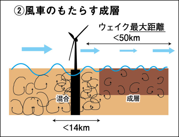 風車が一本立っていた場合、影響する範囲は風下の最大50㌔に及ぶことがわかっている。一方、水中の土台でかき混ぜる範囲は14㌔だ(図②参照)。風車がたくさん建っていると影響は非常に大きなものになる。