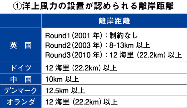 それによると、欧州や中国では洋上風力発電の立地を促進する区域、または禁止する区域を決めるさい、立地を認める離岸距離を定めている【表①参照】。それを洋上風力の設備容量が多い国順(2018年時点)に見てみると、まずイギリスでは、2001年時点では実証実験としておこなったために離岸距離を定めず、そのため立地が沿岸部に集中して、住民による低周波音の健康被害や景観の破壊に反対する運動が起こった。そこで2003年に、沿岸から8~13㌔以上離すと定めた。さらに2012年には風車の大型化による健康被害や景観への影響を考慮して、沿岸から一二海里(22・2㌔)以上離すことが決められている。