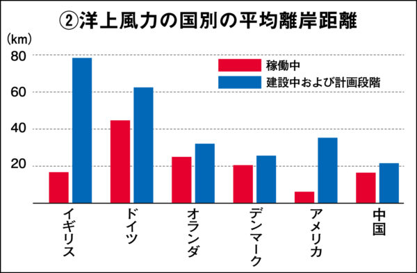 さらに実際に洋上風力発電が沿岸からどのくらい離れた場所に建てられているかを調べてみた【グラフ②参照】。沿岸からの平均離岸距離は、稼働中のもので、イギリスは20㌔近く、ドイツは40㌔以上、オランダは20㌔以上などとなっている。建設中や計画段階のものは現状よりももっと陸地から離れた場所に設置する傾向が顕著で、イギリスでは平均して80㌔近く、ドイツでは60㌔以上となっている。欧州の海は遠浅だという条件があるものの、沿岸からわずか1~2㌔という、住宅地や病院、学校にきわめて近い場所に巨大洋上風力発電を建てるような計画が出ているのは、世界中で日本だけだ。