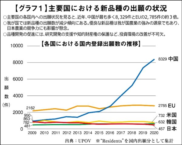 今、日本の種苗は空前の危機の中にある。地域農業を工業的発展の犠牲とする政策が続いた結果、農業従事者は急激に減少している。そのような中で、日本の中で種苗を作れない国になりつつある。野菜の種苗はすでに9割が海外生産。米は国内生産だが、作られる新品種の数は劇的に減りつつある。かつて、日本は世界第2位を占める新品種開発国だった。しかし、ここ10年その地位は下がり続けている【グラフ1】。上位の国は毎年、新品種を作る能力を上げているにも関わらず、日本だけ急減させており、ここ10年で半減している。中でも危機的な状況にあるのが地方自治体による公的種苗事業であり、2007年から2020年までの13年間の間に36%へと激減している【グラフ2】。