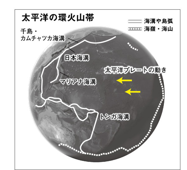 東京大学名誉教授の蒲生俊敬氏は著書『太平洋その深層で起こっていること』(ブルーバックス)のなかで、「太平洋の環火山帯」について次のように説明している【図参照】。