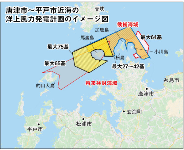 唐津沖にある小川島東側の海域では、インフラックス(東京)が最大で64基(総出力60万8500㌔㍗)の建設を計画している。さらに同社は唐津市馬渡島から長崎県平戸市的山大島までの海域に最大65基(総出力61万7500㌔㍗)の建設も計画している。また、アカシア・リニューアブルズ(東京)と大阪ガスも唐津市馬渡島をとり囲むような形で最大75基(総出力60万㌔㍗)の建設を計画している。そして今年1月には新たにレノバ(東京)が最大27~42基(総出力40万㌔㍗)の建設を計画していることも明らかになった。国内最大規模の計画が局所的に集中し、合計200基をこえる風車が乱立することは、この海域で漁業を営む漁業者にとっては死活問題であり、この反対署名活動を通じて多くの漁業者が反対の意志を示している。