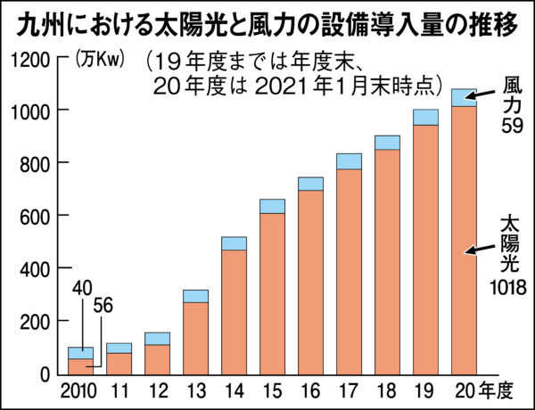 福島原発事故後、政府がFITを導入したのを契機に、日照条件に恵まれる九州では太陽光発電を中心に再エネへの参入があいついだ。昨年3月時点で九州の太陽光設備導入量は1029万㌔㍗(100万㌔㍗級原発約10基分)であり、FIT導入前の2011年比で約14倍に増えている。風力発電は59万㌔㍗で合計すると1100万㌔㍗近い。