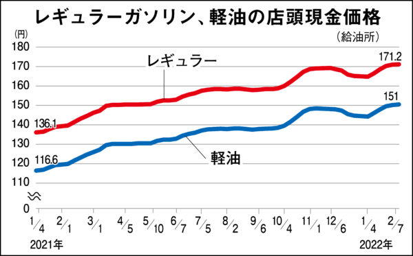 レギュラーガソリンで見ると、給油所の店頭現金価格は昨年1月初め136・1円だったが、2月初旬に140円台、3月に150円台となり、10月に160円台に突入した。今年に入り1月24日の調査で170円台に乗り、その後も上昇が続いている。冬場に欠かせない灯油も一缶(18㍑)の全国平均価格(給油所)が2月7日に2000円をこえた。昨年同時期には1500円程度だから、約500円の値上がりだ。