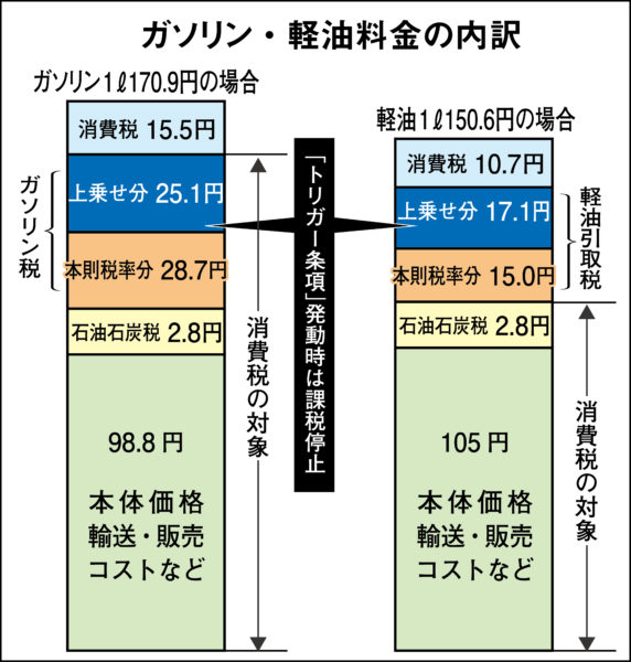 原油価格が高騰しているとはいえ、日本の場合それに何種類もの税金が上乗せされている問題がある【図参照】。例えば1月31日のレギュラーガソリン価格170・9円(1㍑)で考えると、ガソリン価格は98・8円。本来の道路整備財源としてのガソリン税28・7円に、「特例税率」分の25・1円が上乗せされて155・4円になる。それに石油石炭税が2・8円、さらに、これら税金も含んだ額に消費税10%(15・5円)がかかって170・9円にまでなる。支払っているガソリン代の約4割は税金だ。